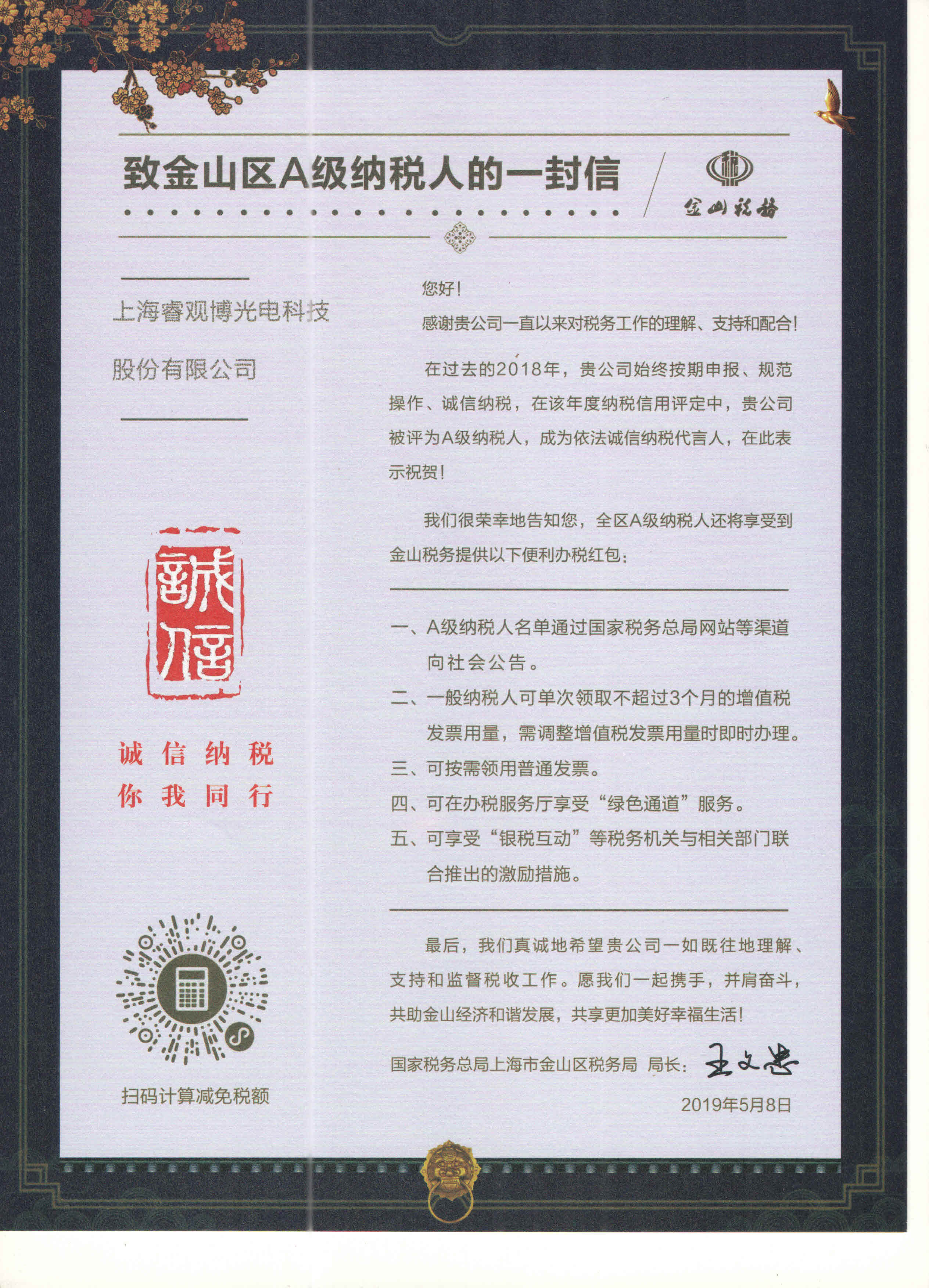 A級納稅企業(yè)證書金山區(qū)A級納稅企業(yè)
