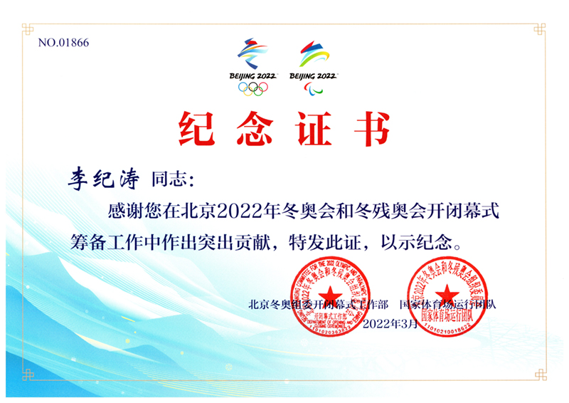 李紀濤冬奧殘奧會證書李紀濤冬奧殘奧會證書