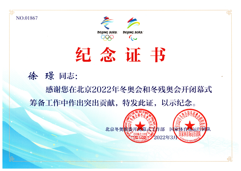 徐璟冬奧殘奧會證書徐璟冬奧殘奧會證書