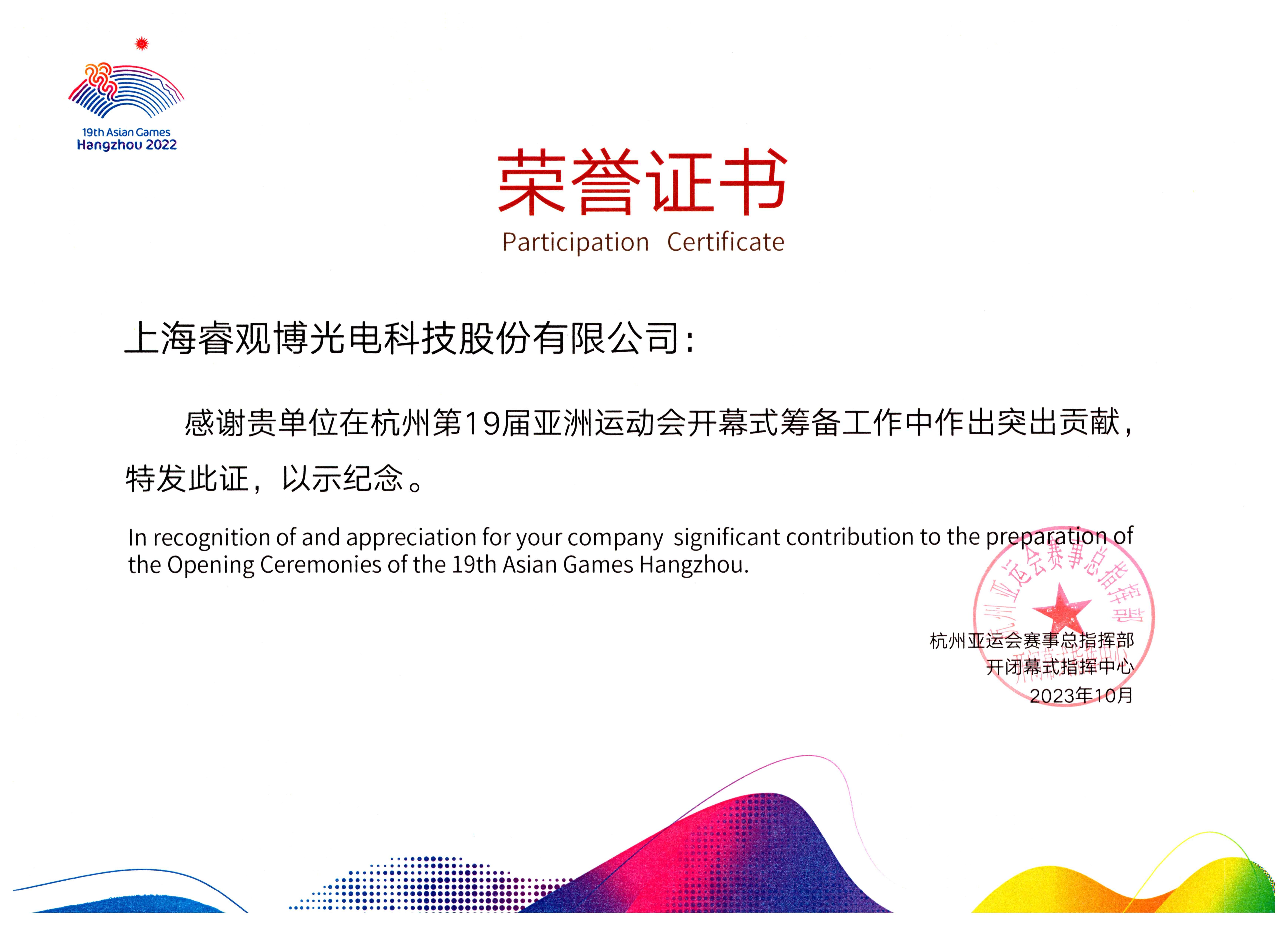 第19屆杭州亞運會榮譽證書亞運會開幕式榮譽證書